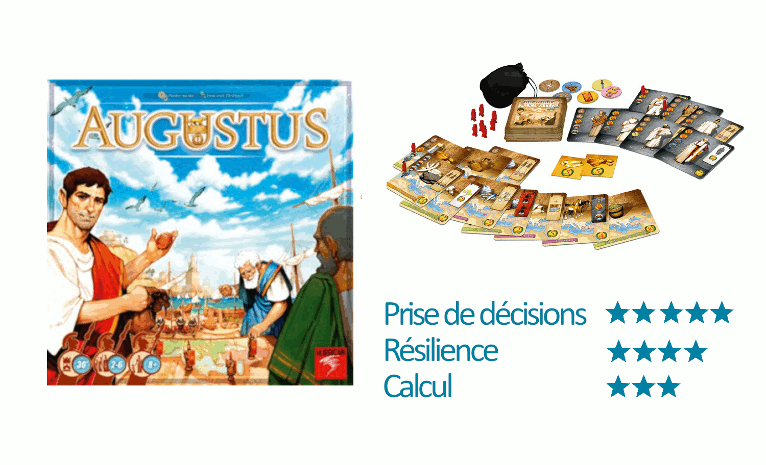 Aujourd’hui, nous passons à la loupe Augustus, un jeu édité par Hurrican . Outre un contexte historique bien sympathique puisqu’il s’agit de conquérir des provinces mondiales au temps de la Rome antique et de s’attirer les bonnes grâces de sénateurs parfois peu engageants, le jeu bénéficie de règles simples et rapidement assimilables, et d’un tempsLire la suite « Augustus, proba et choix dans la Rome antique »
