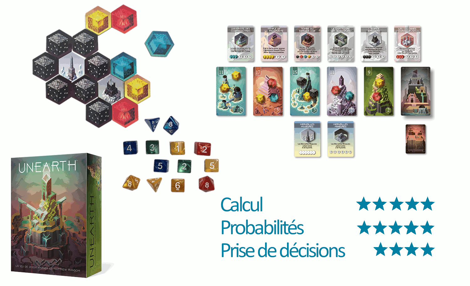 Unearth, proposé par Brotherwise Games et distribué par Edge, est un jeu de société qui fait la part belle aux calculs et aux probabilités. De jolis graphismes, de la rapidité et des règles simples sont les ingrédients de ce jeu au contexte fort sympathique. Regardons de plus près. 1 ) Les règles du jeu UnearthLire la suite « Unearth, un coup de dé pour abolir le hasard »